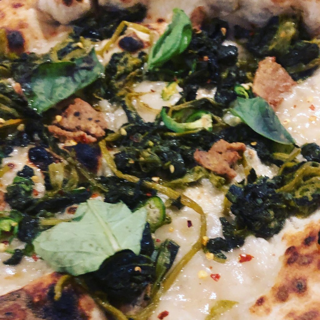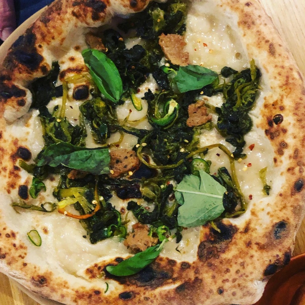 The One with the Friarielli was on a white base with mozzarella, chilli peppers, friarielli (Italian style tender broccoli), crumbled sausage, chilli flakes and garlic oil.