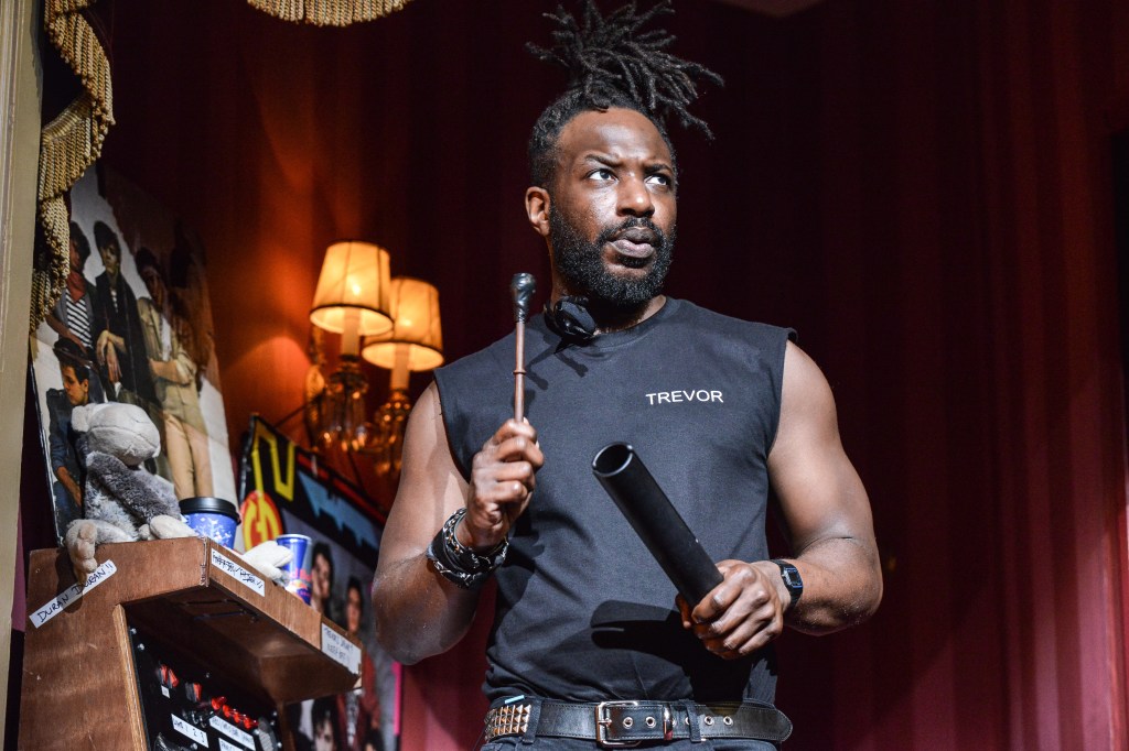 I was proud of myself for immediately embracing the spirit of the occasion, and checking under my seat in search of said dog (spoiler – a set up for a later gag), all the while privy to the sight of the ‘crew’ and ‘stagehands’ busily preparing the stage and trying to right the wrongs already being encountered such as dodgy fixtures and fittings which refused to play ball.