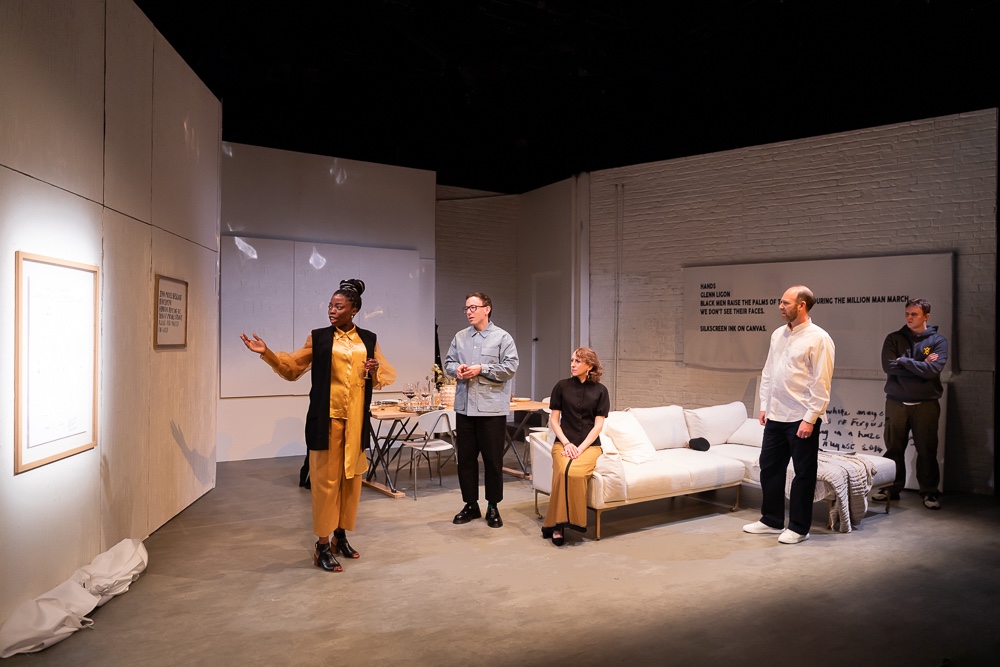 We have the wealthy american epitome of white privilege in Charles (Matthew Pidgeon) and Virginia (Kate Copeland). He’s a property developer (including private prisons…) he’s liberal (check out the juxtaposition of his loose fitting suit and white trainers) he and his wife collect ‘black trauma’ art and they have a pitch perfect smug art dealer friend Eric (Nick Blakeley) who has invited black artist Charlotte (Estella Daniels) to dinner at their apartment.