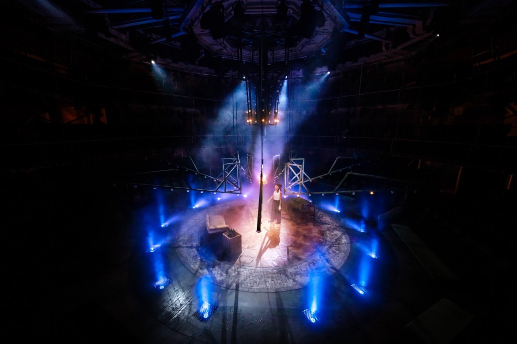 And so on that wonderfully iconic stage, ‘in the round’, it’s not unusual for productions at the Royal Exchange to lean heavily into sparsity of traditional props, furniture and back drops. But often this is complimented or perhaps substituted by the aforementioned use of other mediums to tease the senses.