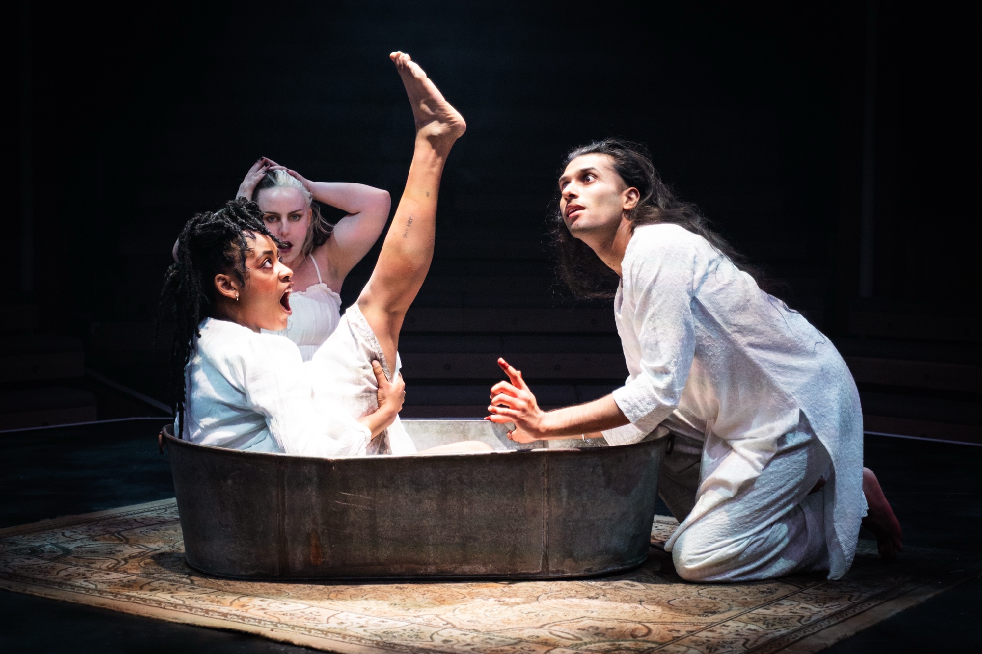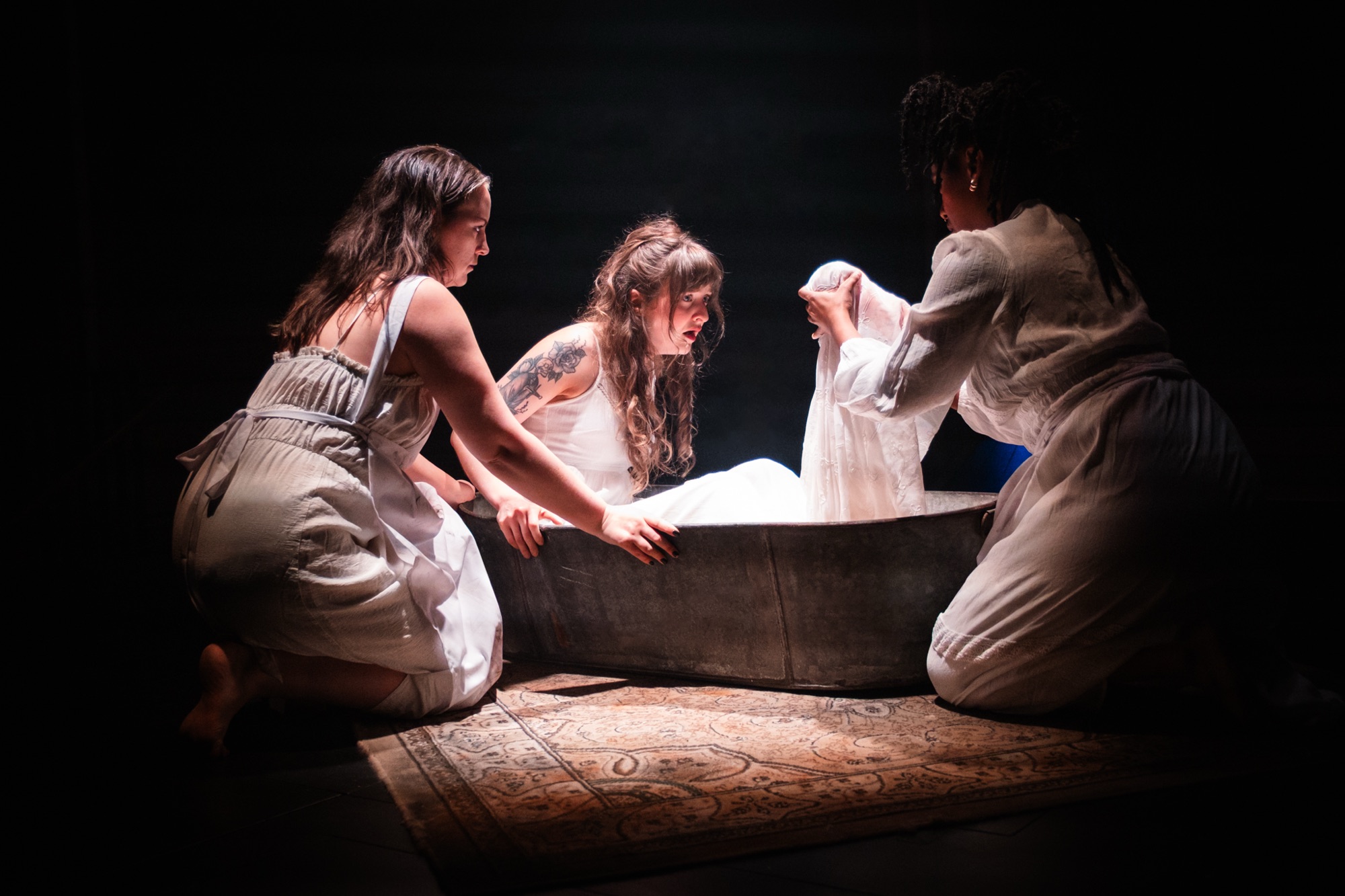 From the moment the lights went down and focus given to the tin bath centre-stage, and unapologetically harrowing depiction of a young Lady Macbeth and still-birth, you knew this wasn’t going to be a production that held back. Fast forward to the end, as rhythmic drumming punctuates the air as Macbeth meets his fate (and we meet his severed head in a sack – which delighted this little death-hag right here), the bookends to this production might suggest that shock-tactics were the order of the day, but this was far from the case.