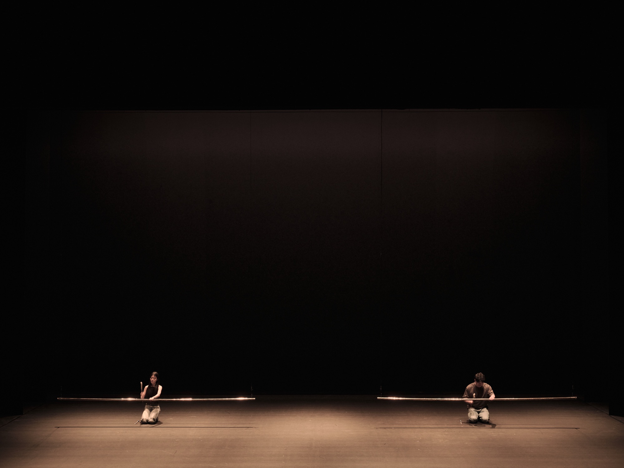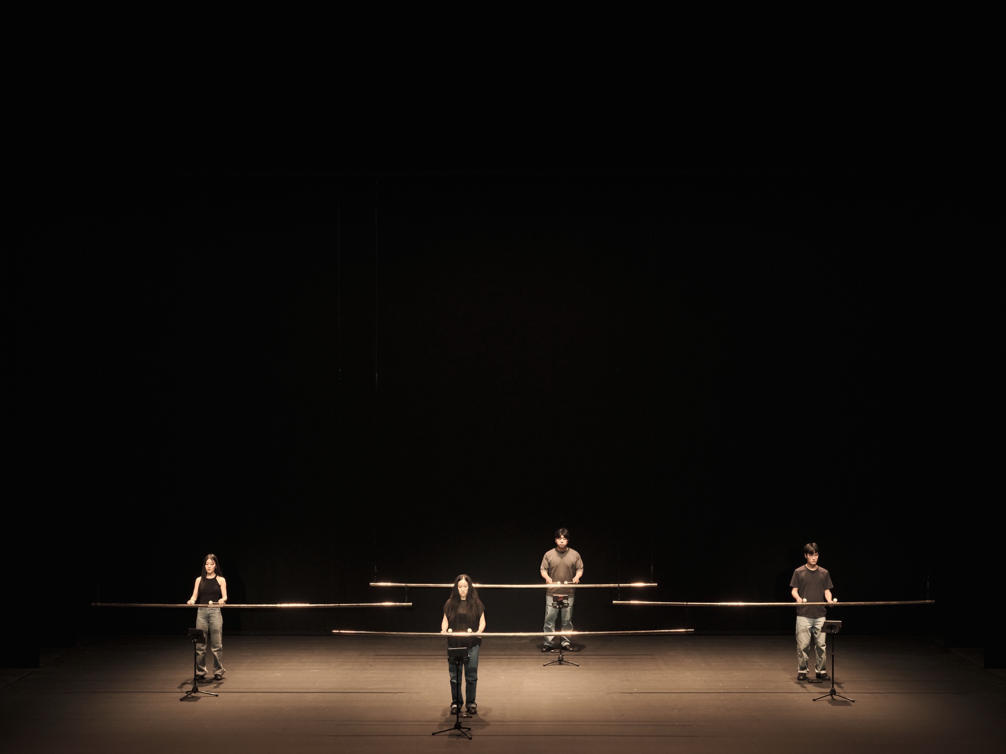 Act 2 and we were thrown a little light, taking us from the shade into a more audio sensory experience. Percussionists Youjin Lee, Akane Tominaga, Victor Lodeon and Gil HyoungKwon (with strings from the RNCM Heartwood Quartet), used brass tubular sculptures which gracefully entered the set from above as though descending from heaven (is it possible I’m stlil in that transcendental state?) the lighting of which matched the beauty of their tone when struck.